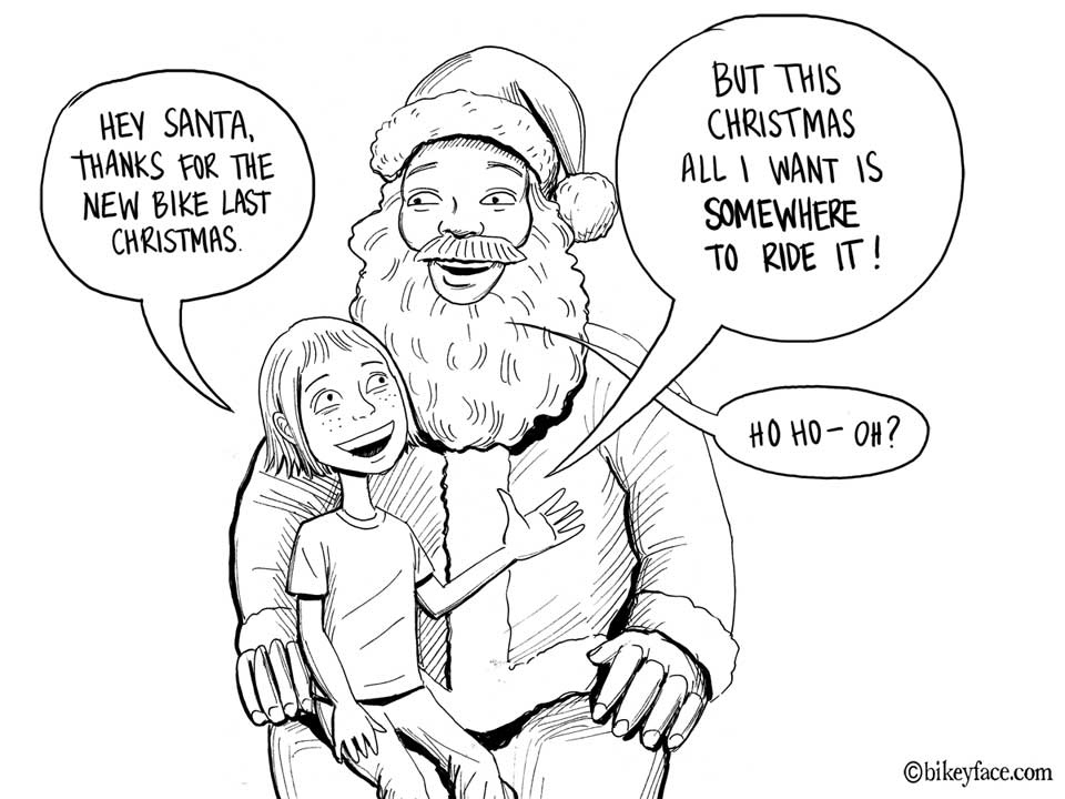 I frequently visit this blog http://www.bikeyface.com, where she illustrates the frustrations of cyclists. This one really hit me. I want my kids to enjoy biking as much as I do, but sadly, we have very few bike friendly locations. I hope that by the time my wife allows my kids to bike, we have more places for them to have fun on bikes.