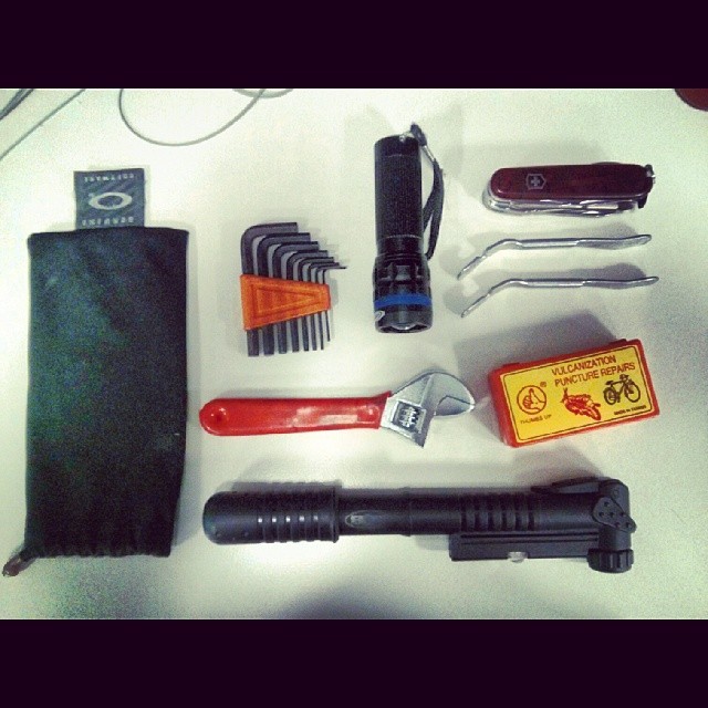Contained in an Oakley Microfiber pouch. I add a spare inner tube and first aid kit when going on long rides.