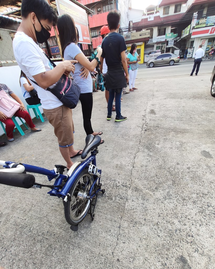 Earlier today I was processing the papers for the transfer of ownership of our car. There was a fee for the certificate and it had to be paid at a bank which was 2-3 kms away. I had the car but parking was an issue at the LTO and if I took it to the bank, I would have to find parking there too. Good thing I had the bike in the car’s trunk. I’ve been keeping it there since the pandemic to avoid bringing the virus inside the house. So out it came from the trunk, unfolded it and pedaled my way to the bank. It took me less than 10 mins to get there. I imagined, if i took the car, it would take me twice as long since there was traffic along the way and I would have had to find parking. The queue to the cashier took longer than the actual travel to the bank. After paying, I was back at the LTO and was able to process everything. Sadly, they don’t release it on the same day.